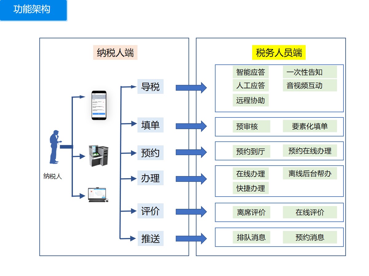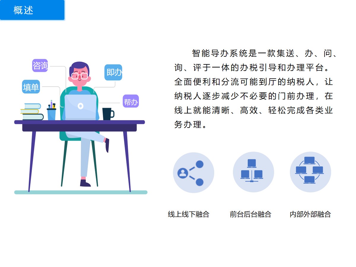 智能导办系统是一款集送、办、问、询、评于一体的办税引导和办理平台。全面便利和分流可能到厅的纳税人,让纳税人逐步减少不必要的门前办理,在线上就能清晰、高效、轻松完成各类业务办理。
